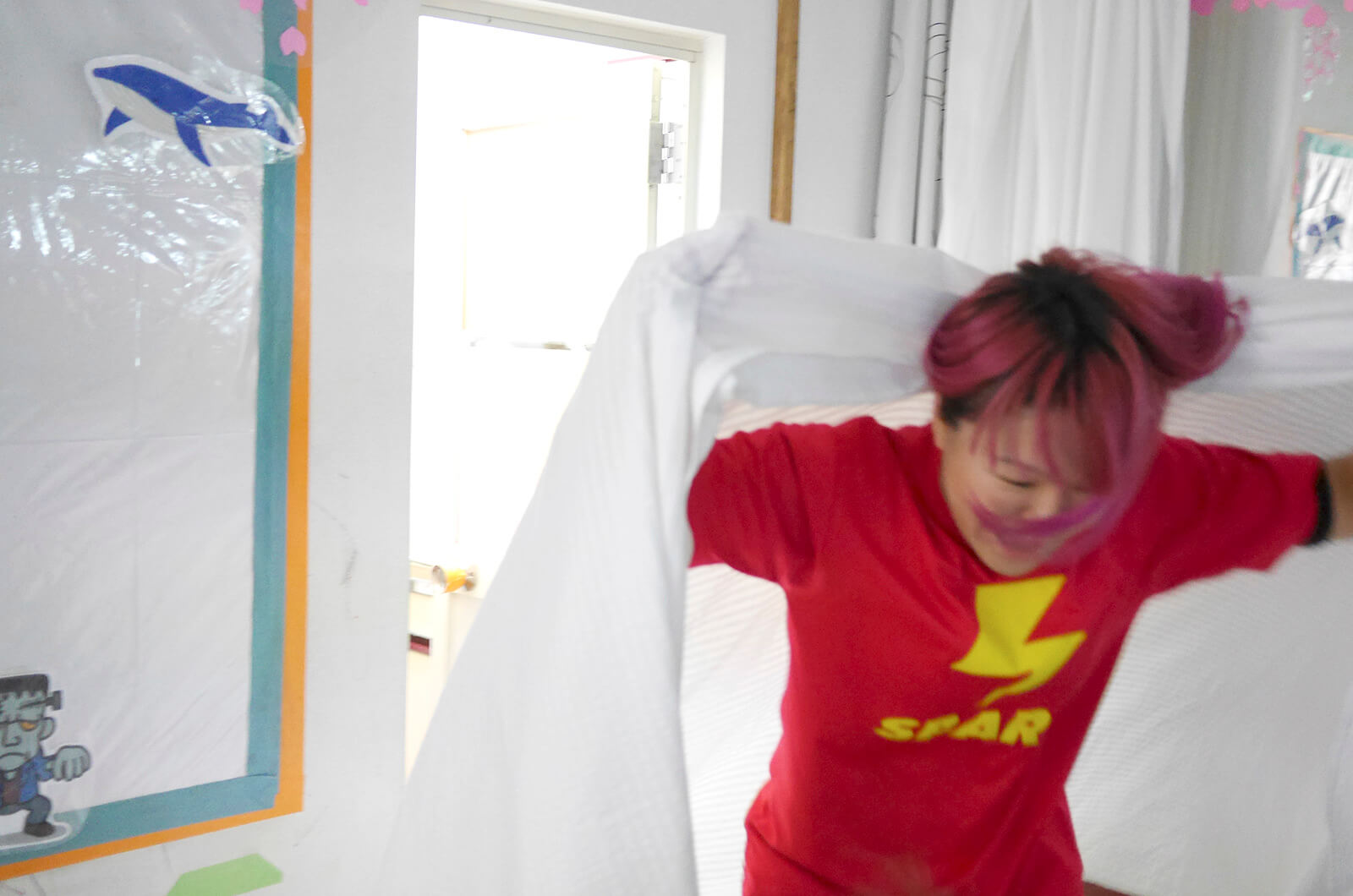 定行さんのインタビューを始める前に、実際に施設で行われているプログラムを見学させてもらうことになりました。1人の子どもに対して、定行さんを含む2人のスタッフが付いて、部屋中を追いかけ回ったり物陰に隠れたり、一見遊んでいるような賑やかな雰囲気です。それにしてもものすごい運動量で、約1時間のクラスが1日に5回もあるというから驚きです。