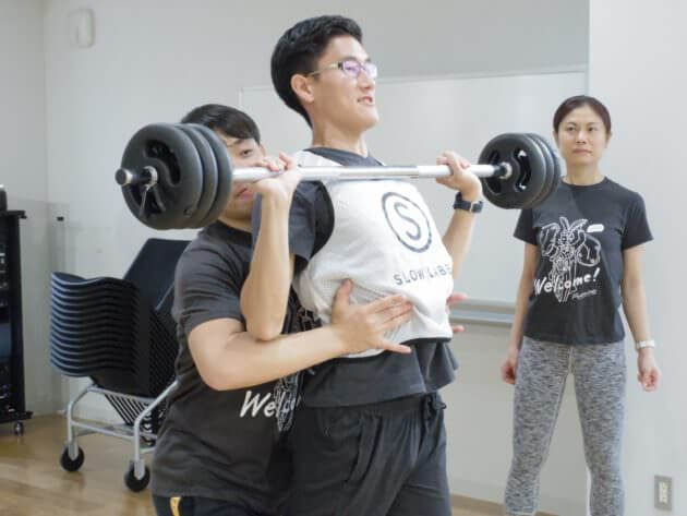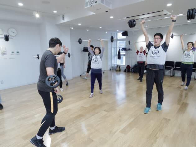 今回はみなさん3キロほどのバーベルでしたが、中には普段から運動している方もいたので、その方はなんと重りを3つもつけてトレーニング!