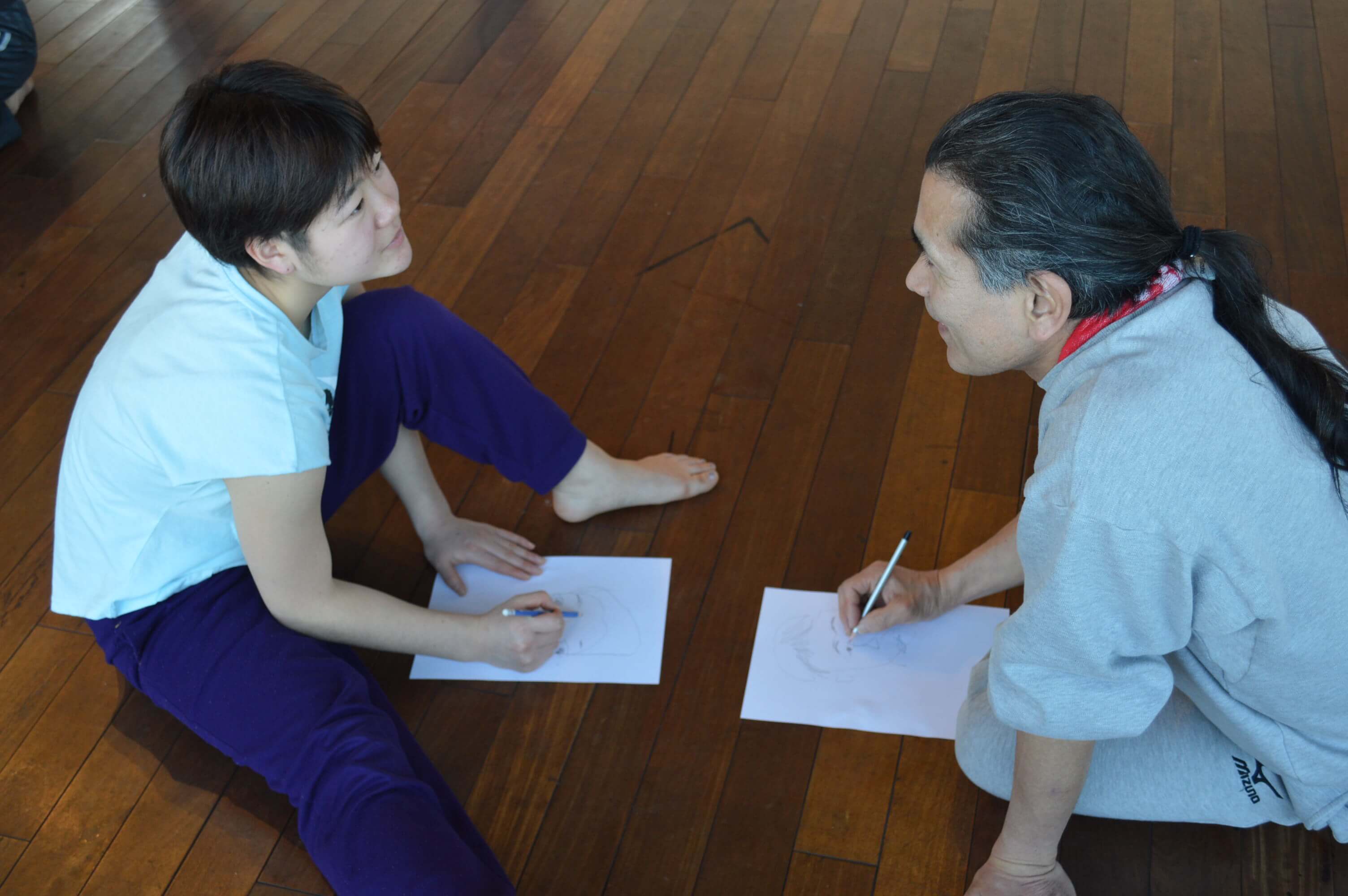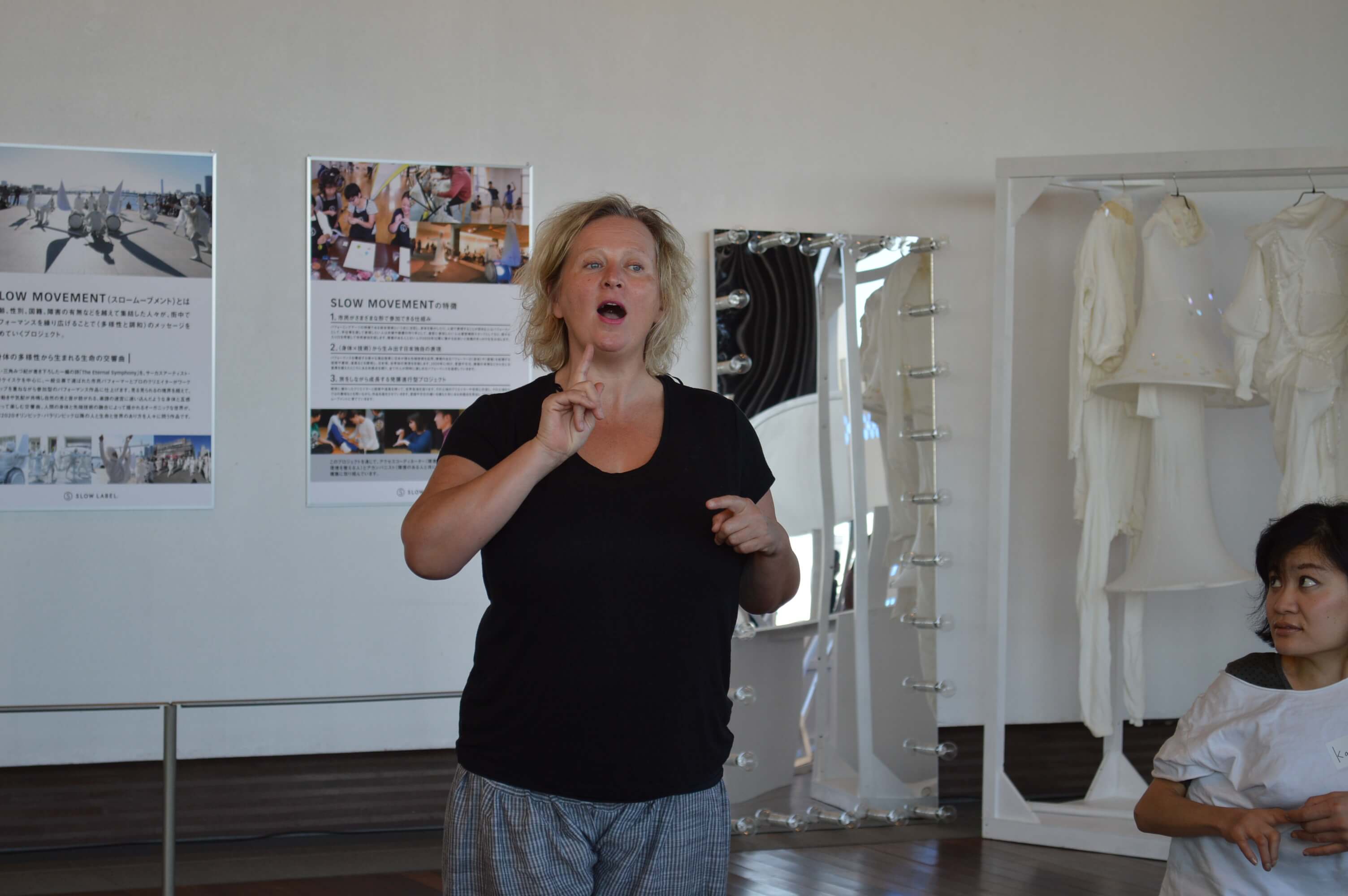 「みなさん、遊ぶのは好きですか?」ジェニーさんのこの言葉で始まりました。ジェニーさんの横で、英語通訳、日本語通訳、そして、難聴のパフォーマーの方へ向けて手話通訳が同時に行われました。これほど通訳が多い現場はスロームーブメントならでは。全員が手話のサインネーム(自分の特徴を身振りで表します)で自己紹介をしました。