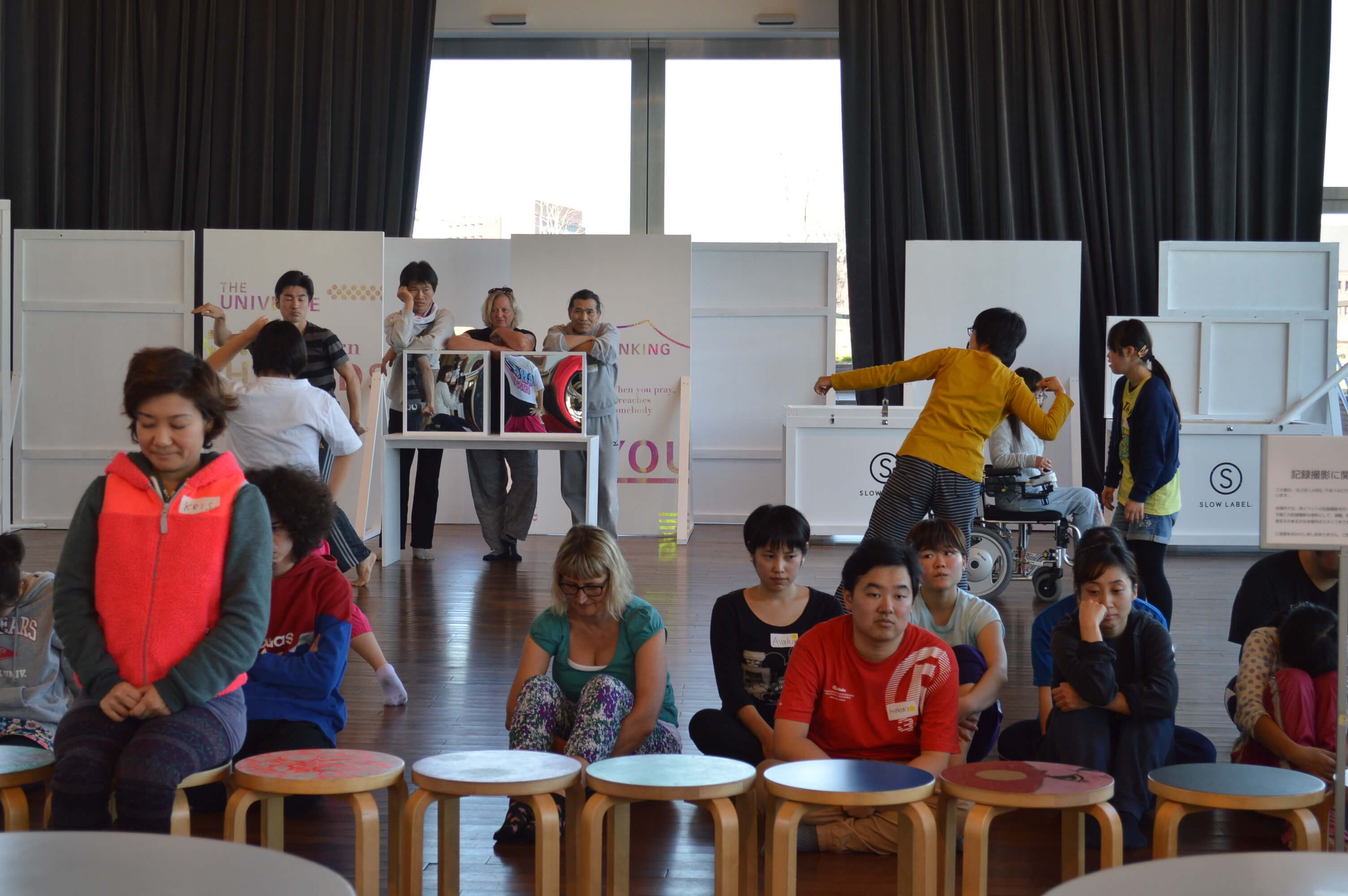 ジェニー・シーレイさんは2012年ロンドン・パラリンピック競技大会開会式の共同デイレクターを務め、イギリスで障害のあるアーティストの育成や舞台芸術のアクセシビリテイ向上を牽引された人です。どんなワークショップになるのか、最初は皆さん緊張気味?!