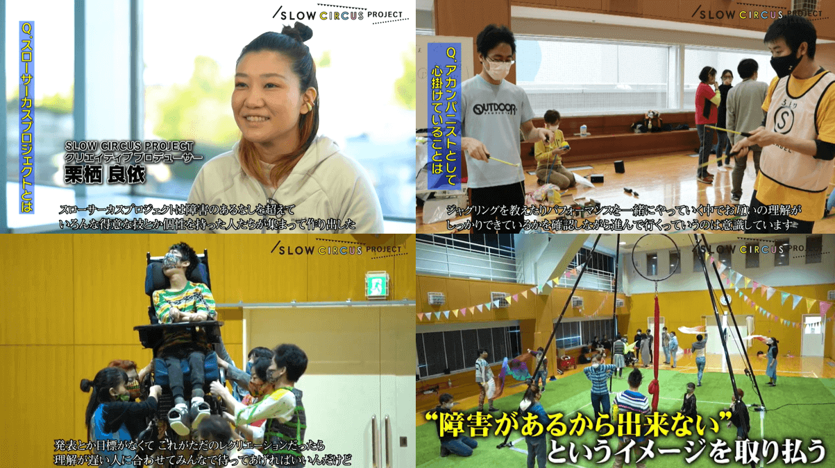 パフォーマンス公演に向けてのリハーサル風景と、障害のあるパフォーマーや保護者へのインタビューや、障害者と共に舞台を共に創り上げていく「アカンパニスト」のインタビューを通じて、サーカスを通じて社会をスローに変えるプロジェクトの現場をご覧ください。